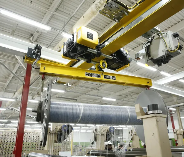 Whether you are loading yarn beams onto looms or moving material to be cut in your textile facility, R&M's equipment is designed to meet your needs for efficiency and savings. Our space-saving NRGmaster crane maximizes your floor space and under-crane height, while providing you with industry-leading technologies such as a Racon3 joystick radio control and condition monitoring with our HoistWatch device.